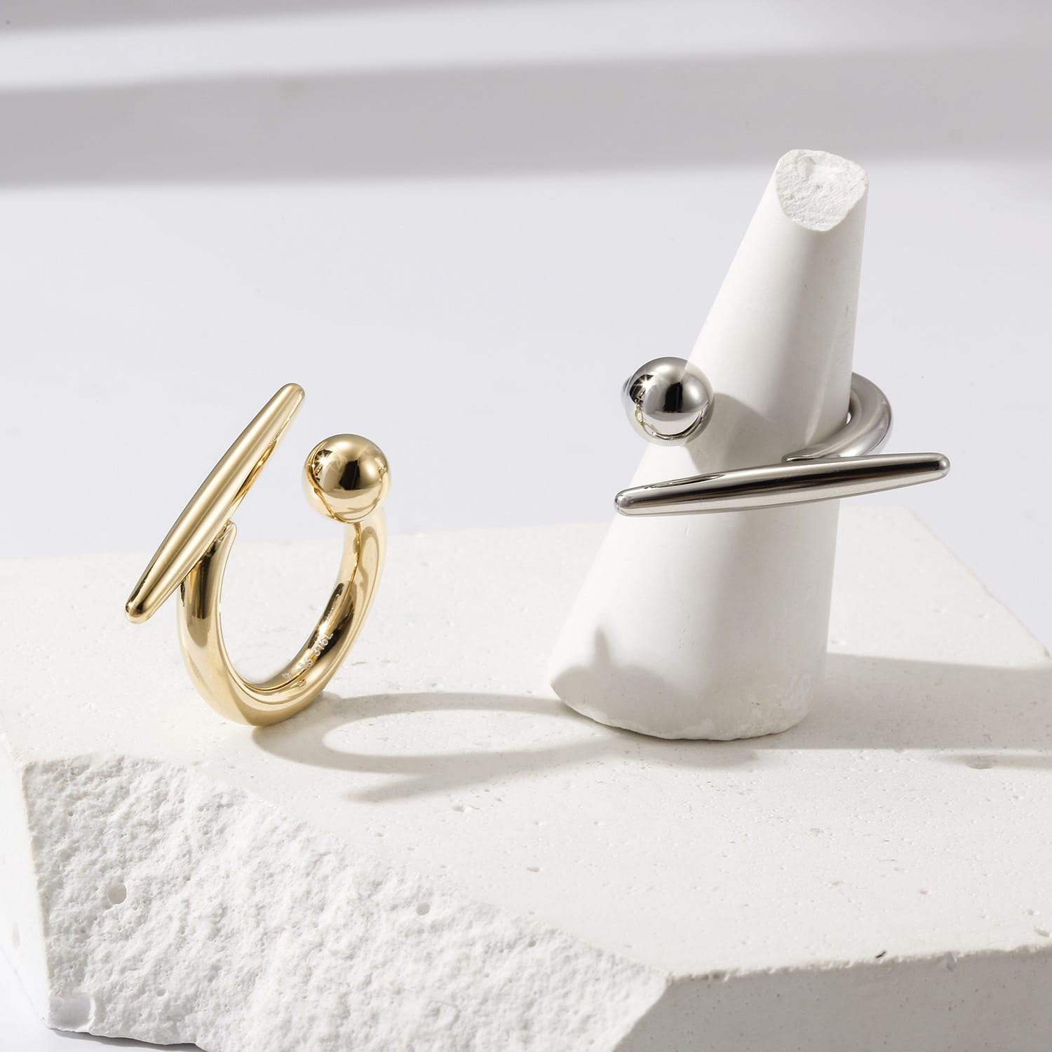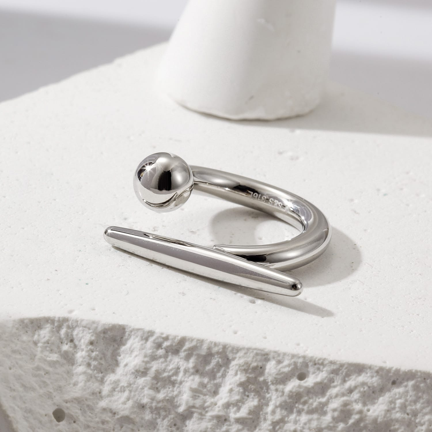A polished geometric style ring with a sphere and elongated bar in perfect asymmetry.