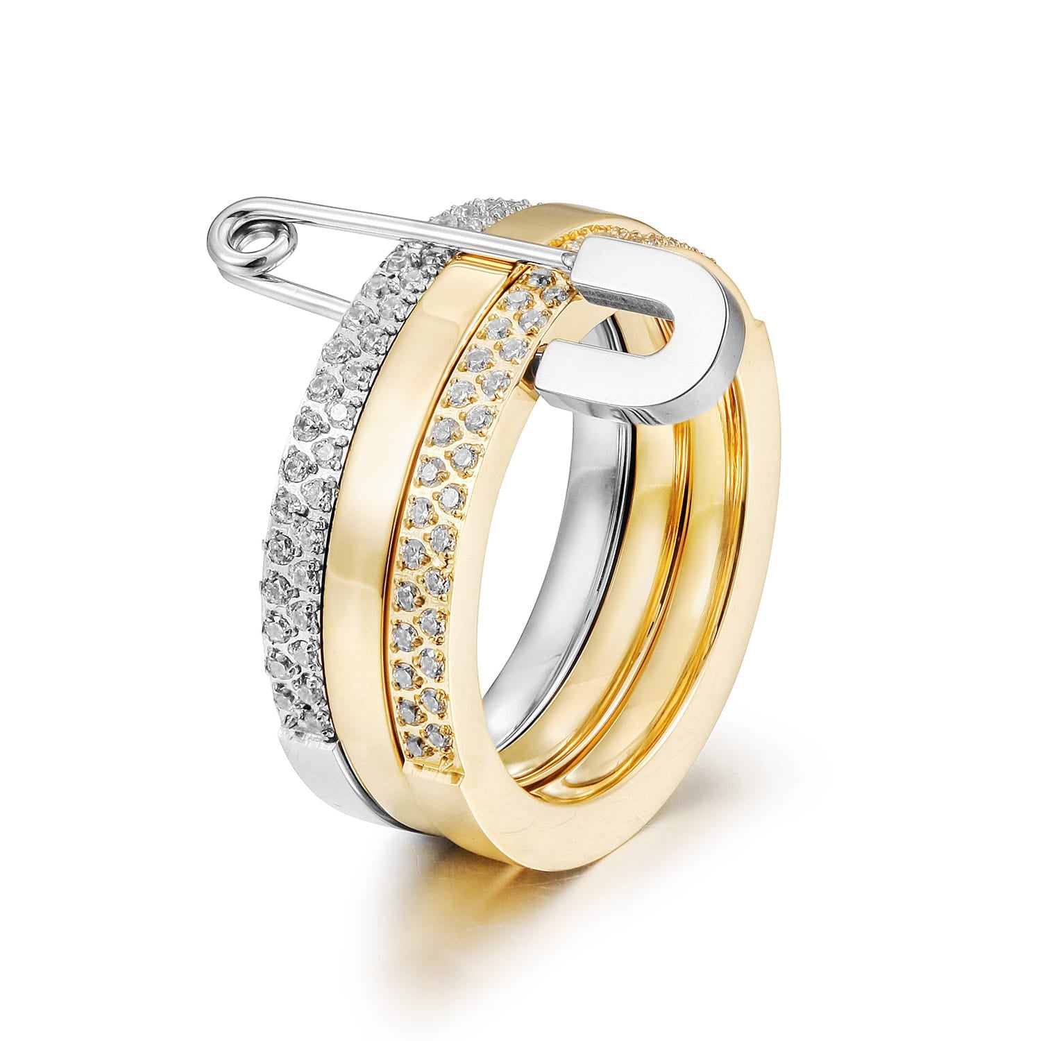Three interlocked bands in gold, silver, and cubic zirconia, held together by a safety-pin charm.